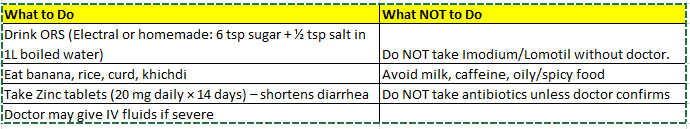Drink ORS (every 15–20 min) (available at shop or homemade: 1 liter of clean water + 6 teaspoons of sugar + ½ teaspoon of salt).