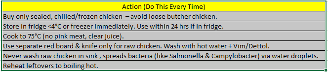 Use One Red Color Chopping Board and Knife for Raw Chicken. Use Hot Water & Detergent & Dettol to Clean.