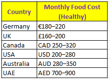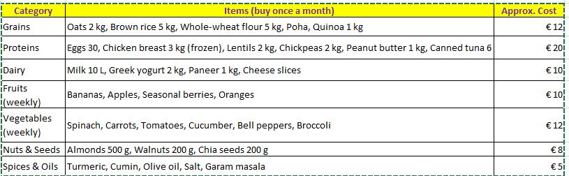 Monthly Grocery List under €50–60 / £45–55 / CAD 80–100 (for one person):